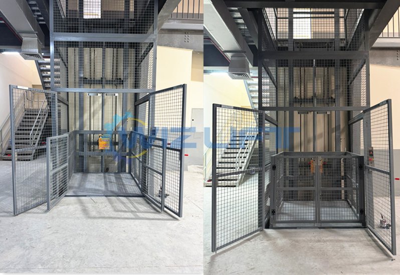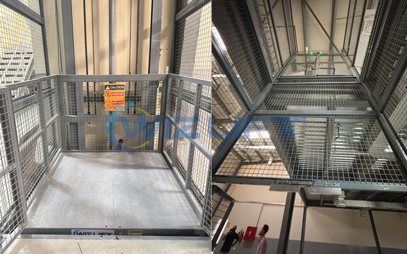 This is cargo lift machine was installed in one automobile parts new warehouse. The lifting height is 4350mm, load capacity is only 1000kg, customer work site is already ready when they contact with us. So we recommend the most suitable platform size W1570*D1450mm for them according to their shaft size 2000*2000mm. In addition, In order to ensure the safety of the goods lift during operation, to prevent anyone from approaching the machine, we added three side 40*40mm safety mesh enclosure for customer.